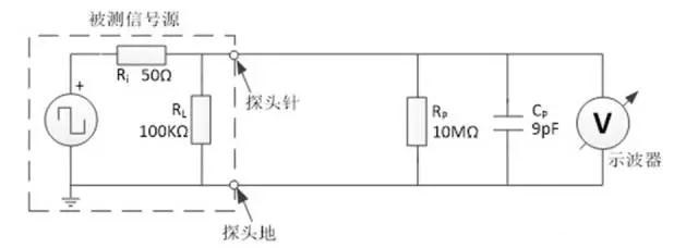且看圖解,如圖3所示為示波器使用探頭進(jìn)行信號測量理論上的等效模型。探頭與示波器組成具有一定輸入電阻和輸入電容的測試設(shè)備;被測量信號等效為具有一定內(nèi)阻與工作負(fù)載的源。