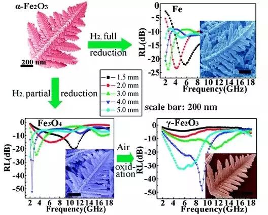 文獻(xiàn)鏈接:Hierarchical Dendrite-Like Magnetic Materials of Fe3O4, γ- Fe2O3, and Fe with High Performance of Microwave Absorption
