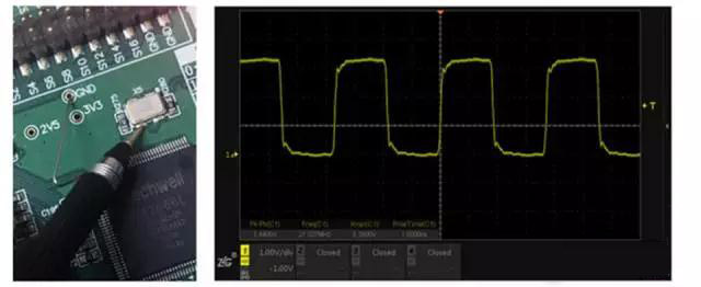 以晶振信號測量為例,如圖1所示為常規(guī)的鱷魚線接地測量方法,可看到信號過沖嚴(yán)重伴隨振蕩,和想像中的方波不一樣。而圖2所示的短地線彈簧接地測量方法,波形端正不少,顯然工程師的方法沒錯。
